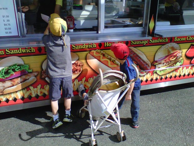 Foremost on the boys minds at the fair, or indeed, any time we leave the house, is to eat. I was happy that there were a few healthy options, and we managed to get some wheat-free items as nearly 3yo is allergic. I was disappointed I didn’t get a deep-fried snickers, but you can’t win them all. I did have an adult beverage to remind myself that I don’t have to sink to their levels all the time, and because I wanted to sit at a table with an umbrella without feeling guilty. Combined with some half-melted ice cream, I’d probably not get the drink next time.