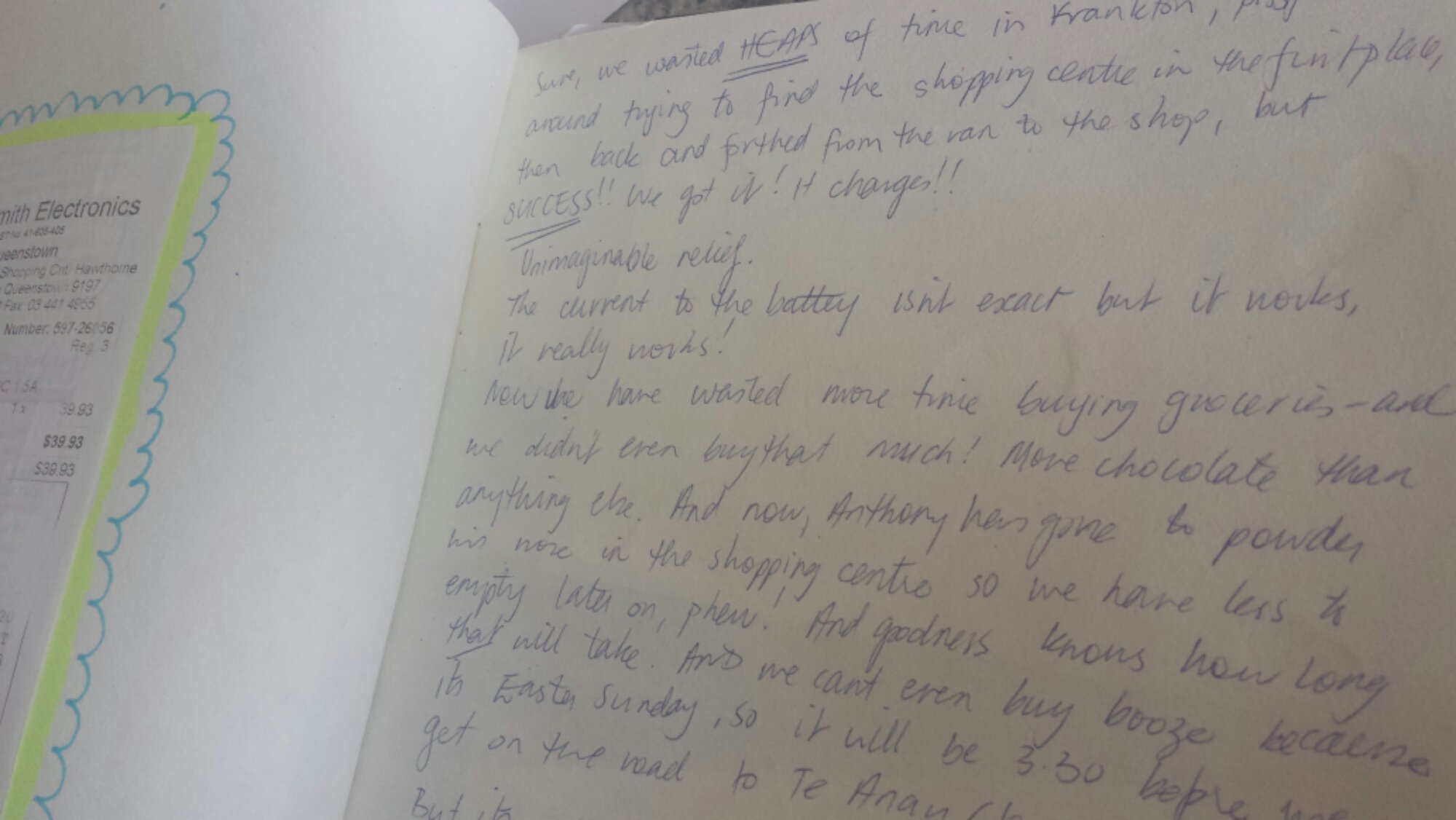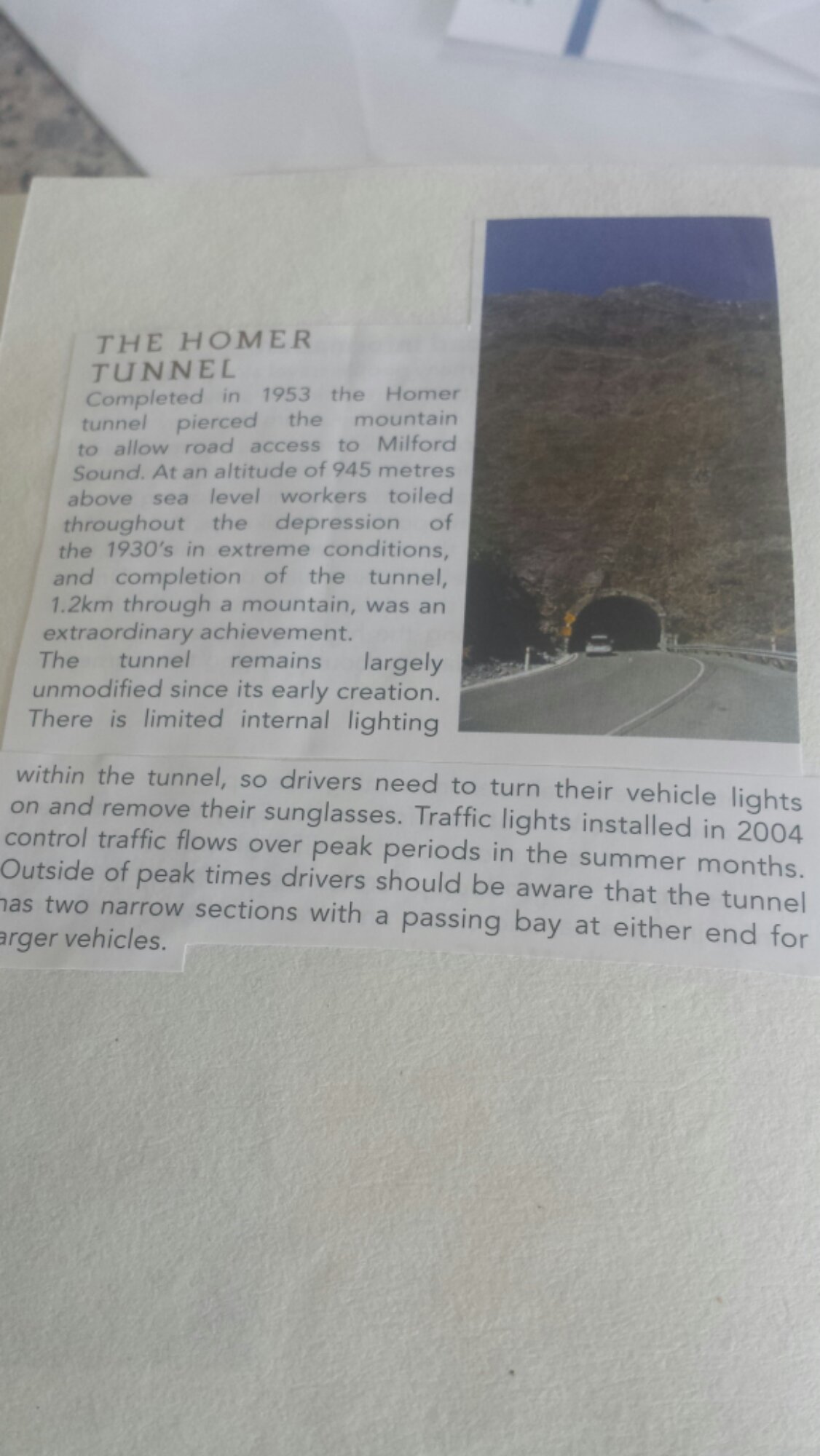 When Husband and I holidayed there, there were no guard rails, but lots of sheer drops beside the road. There were no billboards, and plenty of sheep. I can only assume there is much of the same there now. I bought a scrap book at the airport just before we flew out, so I could record funny anecdotes for posterity. Let me grab it to jog my memory, because babies have erased much of my memories and high-functioning brain cells.