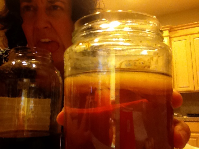 Would it be damaged from being poured into a new jar? I searched online and found a video of a woman picking the bloody thing out of the jar – ewww – and putting in the new jar. I don’t think so. I did eventually just gently pour it into the bigger jar with the tea and more of the bottled stuff,  just to be on the safe side.