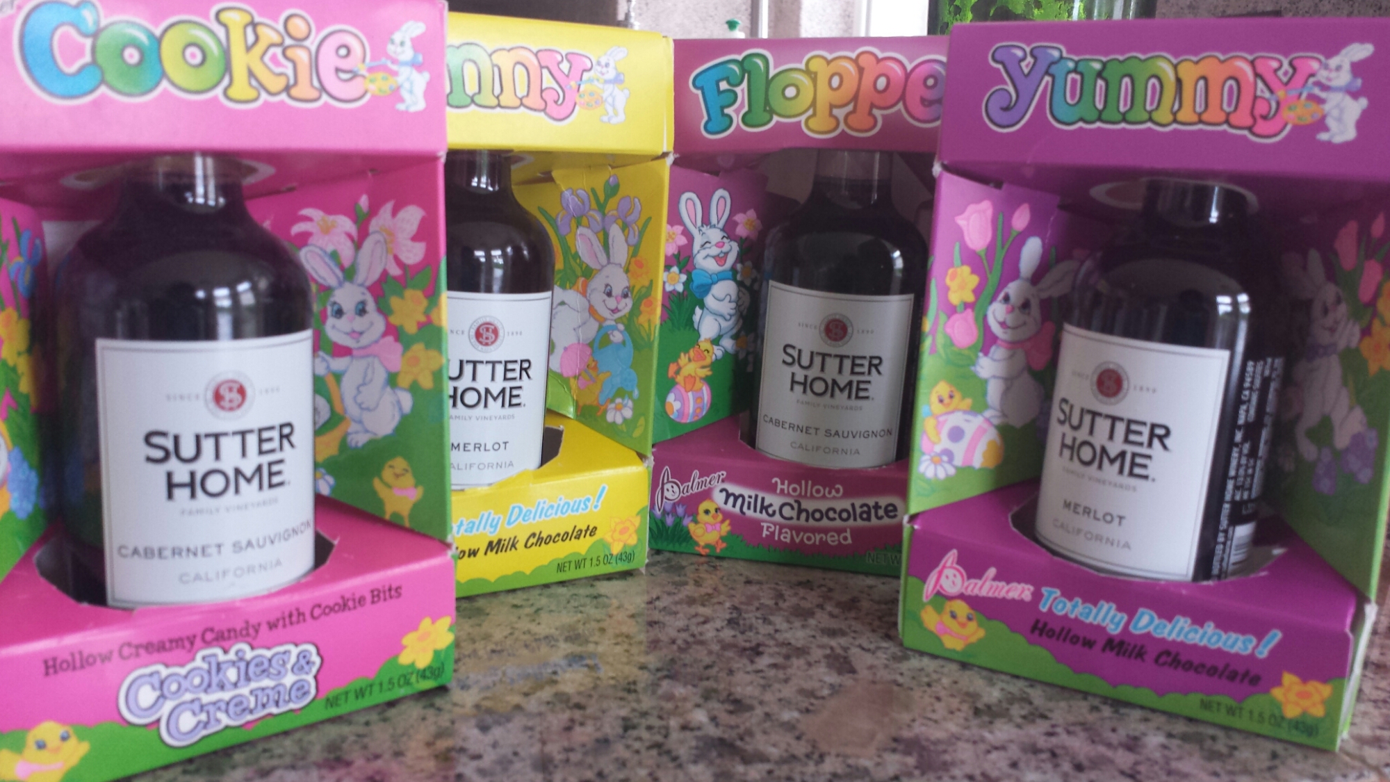 I didn’t find any plastic eggs, but I did find some cheap chocolate that the boxes fit my widdle wine bottles!