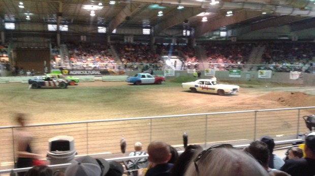 And then today we were living large in !Murica! watching some smash ’em up derby at the fair, and in rolled this long white boat of a car, sans door handles and windows, of course. The boys thought it was a Lincoln because Husband has one and they look similar – there’s probably other long boatcars of other brands floating around the roadways, too.
