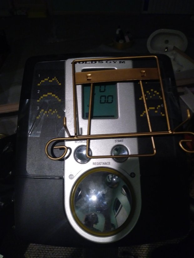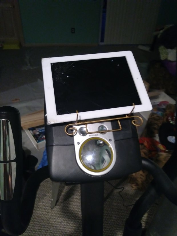 I got my gear on this morning, only to find, though, that there was nothing to rest the ipad on. No little shelf or hooks or anything at all to keep me occupied and forget that I’m burning food that I shouldn’t have eaten.