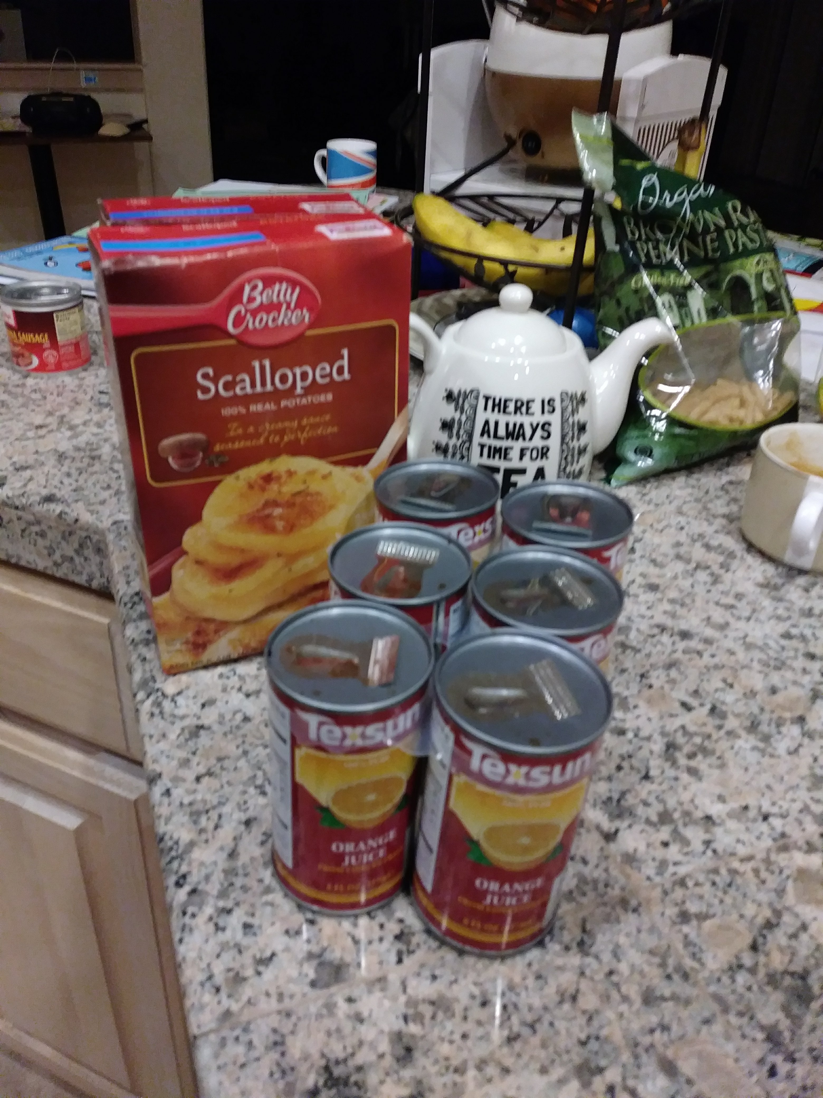 What did they eat first? Canned sausage, fuckers. Most of the canned stuff was not gf and 7yo got a but whiny, so he’ll probably die first in the event of an actual disaster scenario. 10yo has always been a but picky, so he’ll come a close second. 9yo was a bit more adventurous and tried a can of spagetti-os and some shitty mac and cheese. Now he realises that all the good food we eat is very good, and the canned stuff is not. “But Mom, why would we eat this stuff?” started the conversation about out of commission roads and empty shops and lunatics with guns. I ate a can of that Dinty Moore and bring me back the braised steak and onions, I say! That stuff was dog food. I also ate ate some scalloped potatoes, and after living to tell the tale, I do not recommend.
