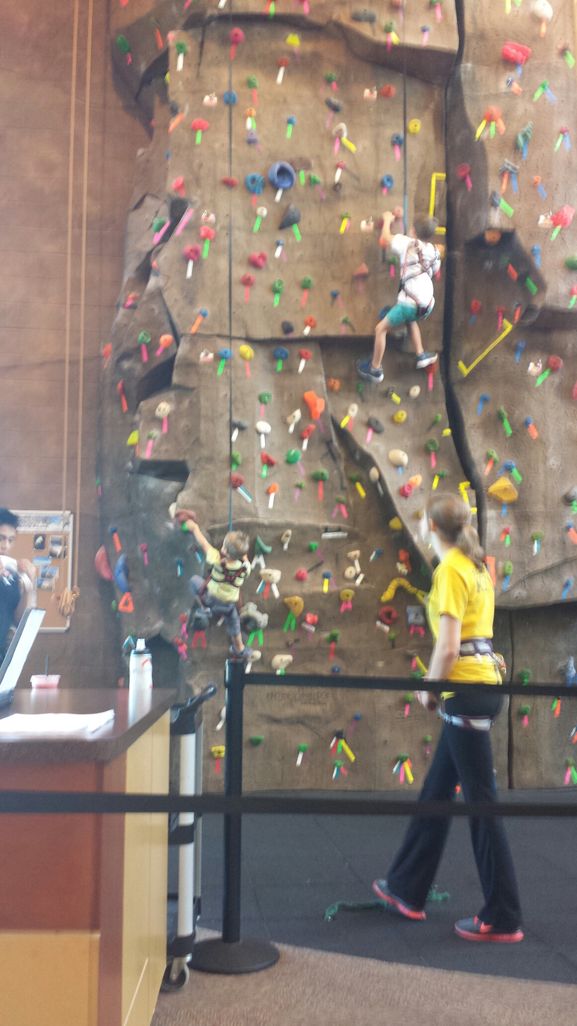 7yo made it to the next level in his swimming class, anf rock-climbing was the bribe/lure/reward. 3.5yo gave it a go last week when 5.5yo did his climb, so he managed to get a little bit higher this time.